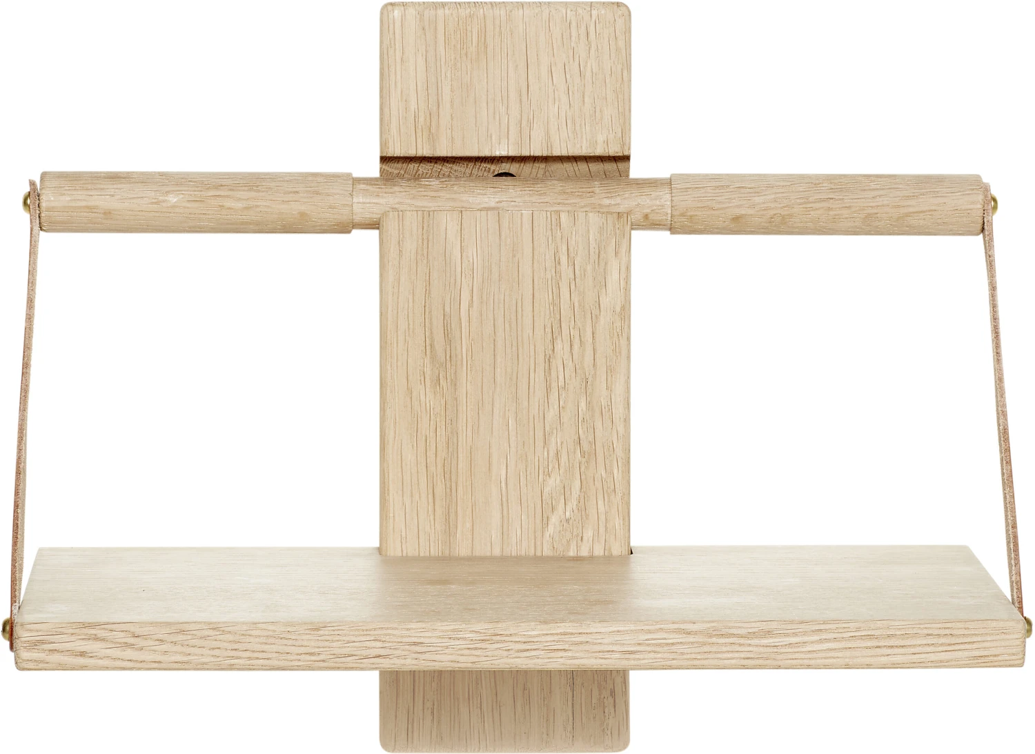 Wood Wall er nem at montere på væggen, og der er mulighed for at ”bygge” flere hylder oven på hinanden, således at hylden fremstår som en reol. Den er fremstillet af massivt ege træ, og stropperne er ægte kernelæder.