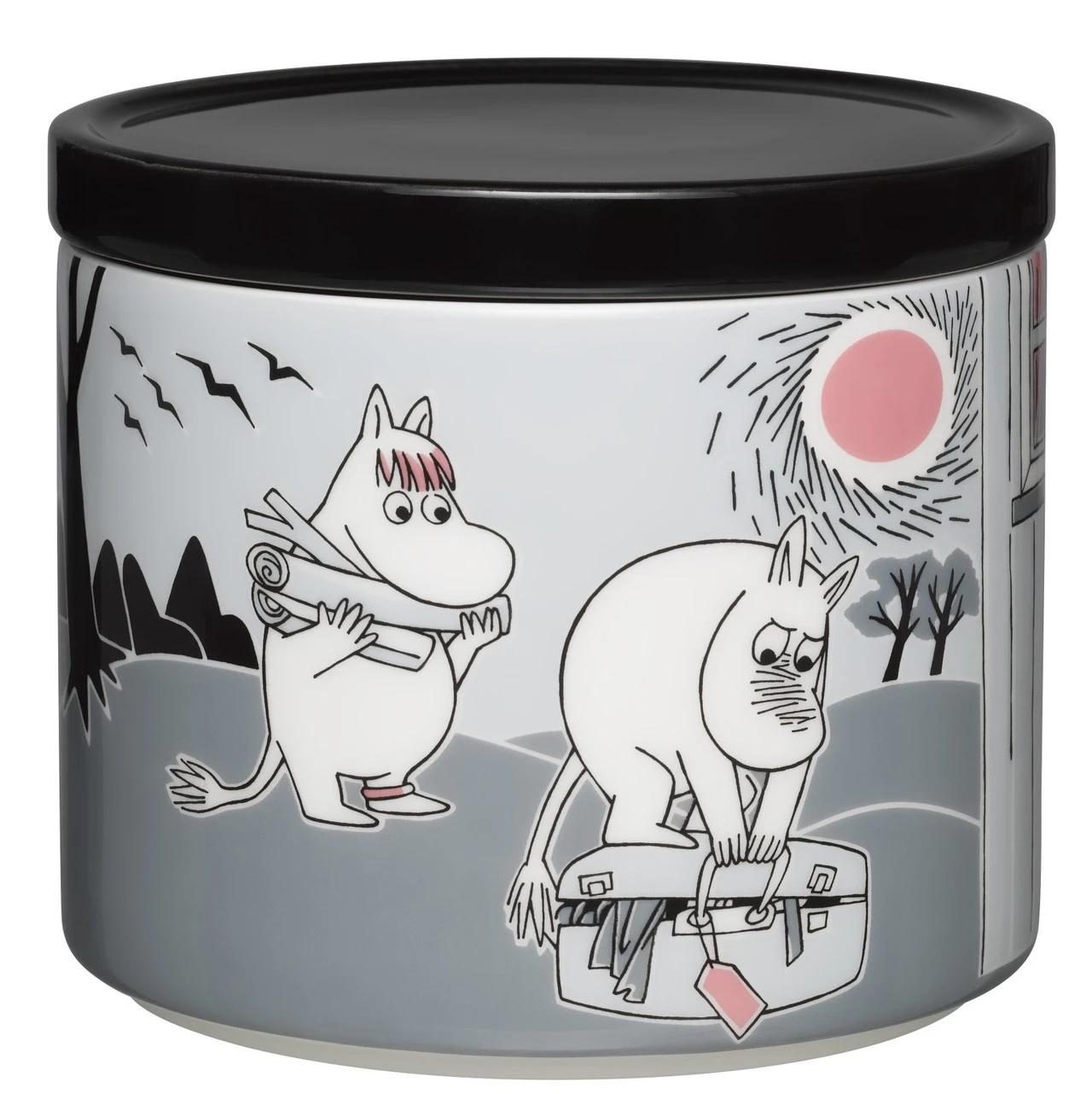 Krukke 70 cl med motivet Mumi flytter. Mumitrolden og Snorkfrøkenen beslutter at gå ud og finde ud af, hvorfor alle forlader Mumidalen. Snart finder de ud af, at årsagen til den pludselige flugt er en komet, der forventes at ramme jorden når som helst. Selv Mumifamilien flygter mod en hule, hvor de kan være i sikkerhed. Til sidst blvier den alarmerende komet drevet væk af naturens kræfter, og kometen rammer ikke Mumidalen.