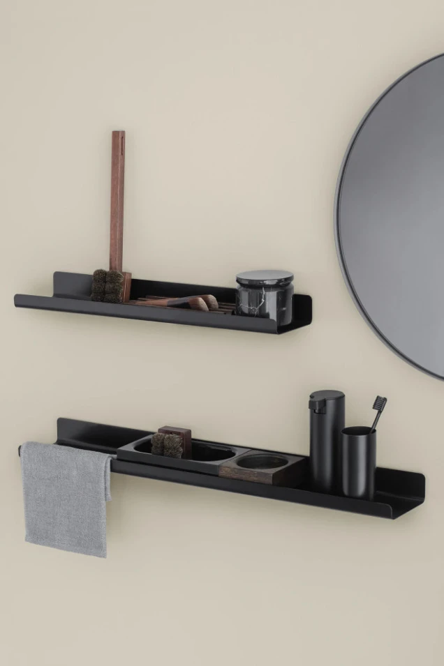 Wonder Wall! MODO væghylden er lige så tidløst elegant som sit materiale: titaniumbelagt, ridsefast og korrosionsbestandigt stål. Og det er ikke alt: Tre forskellige opbevaringsbakker af eg eller akrylglas kan matches, som giver den sorte ramme struktur og farve. De integreres vidunderligt i hylden og sætter perfekt scenen for tandbørstekopper, sæbedispensere osv. Inklusiv fastgørelsesmateriale.