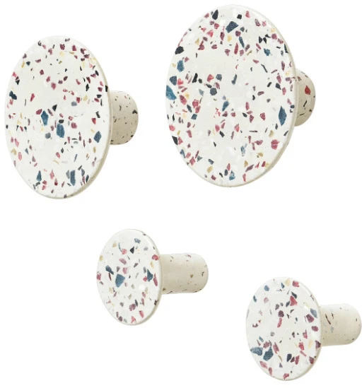 Vægdekoration med en funktion: PONTO vægkrogene i terrazzofarvet kommer som et sæt af 4 i to forskellige størrelser (2 x Ø 8,5 cm, 2 x Ø 5 cm). Til gangen, køkkenet eller badeværelset – knagerne i PolyStoneb giver stilfuld orden og kan kombineres som du ønsker. Inklusiv fastgørelsesmateriale.