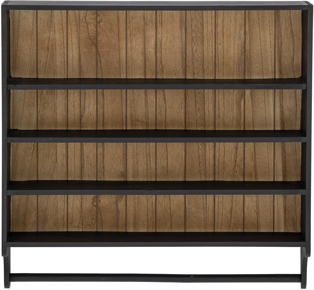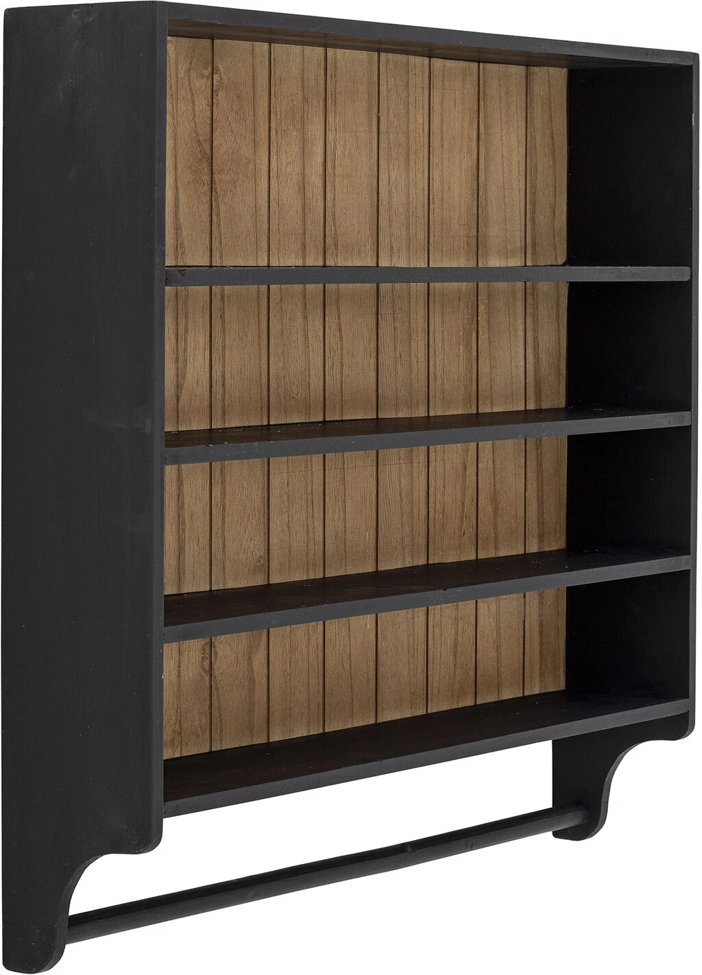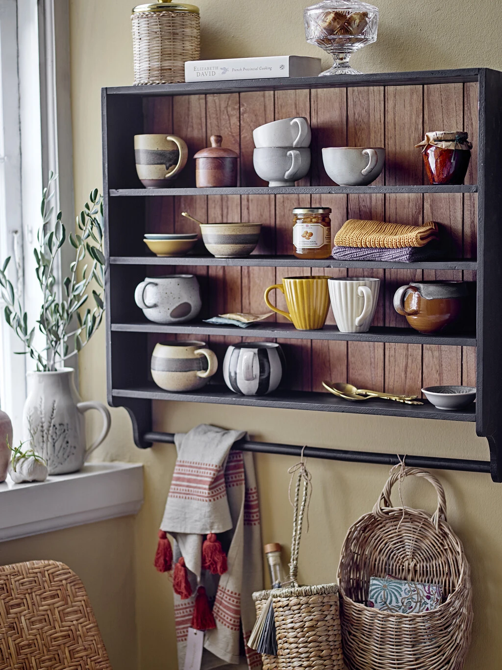 Loup Hylden fra Bloomingville er lavet af sortbejdset fyrretræ samt paneler indvendigt i en naturlig farve, som skaber et rustikt look. Hylden er perfekt til at fremvise din samling af unikke krus eller til små loppefund og dekogenstande, for at skabe en hyggelig atmosfære. Til multifunktionelt brug placeres kroge eller papirsnor i bunden til at hænge viskestykker og kurve op.