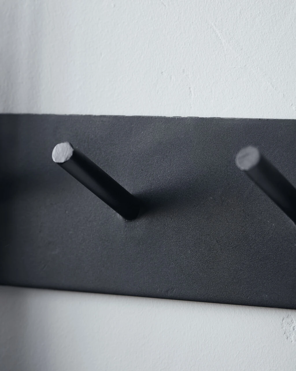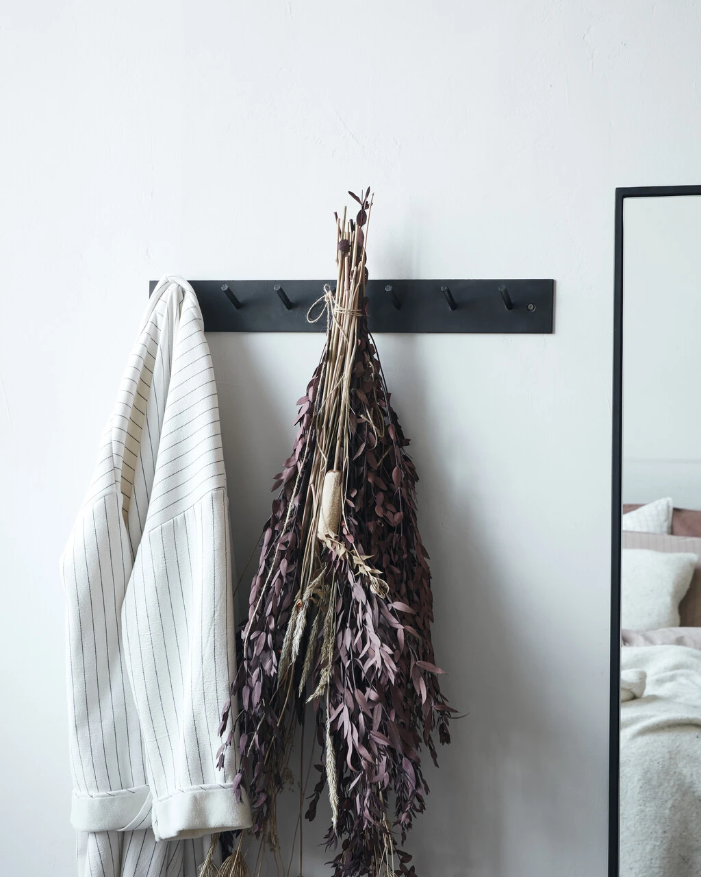 En simpel, sort knagerække til dit soveværelse. Enkel men alligevel så iøjnefaldende med sit tidløse og nedtonede design. Knagerækken hedder Kyrkja, er lavet af jern og har 7 knager. Montér den på væggen i dit soveværelse som et sted at opbevare din kimono, loungewear, jakker, tasker eller hvad du end måtte have brug for. Med dette byNORD-design får dit soveværelse en diskret detalje, der er med til at skabe et roligt og afslappende rum. Ikke egnet til badeværelset.