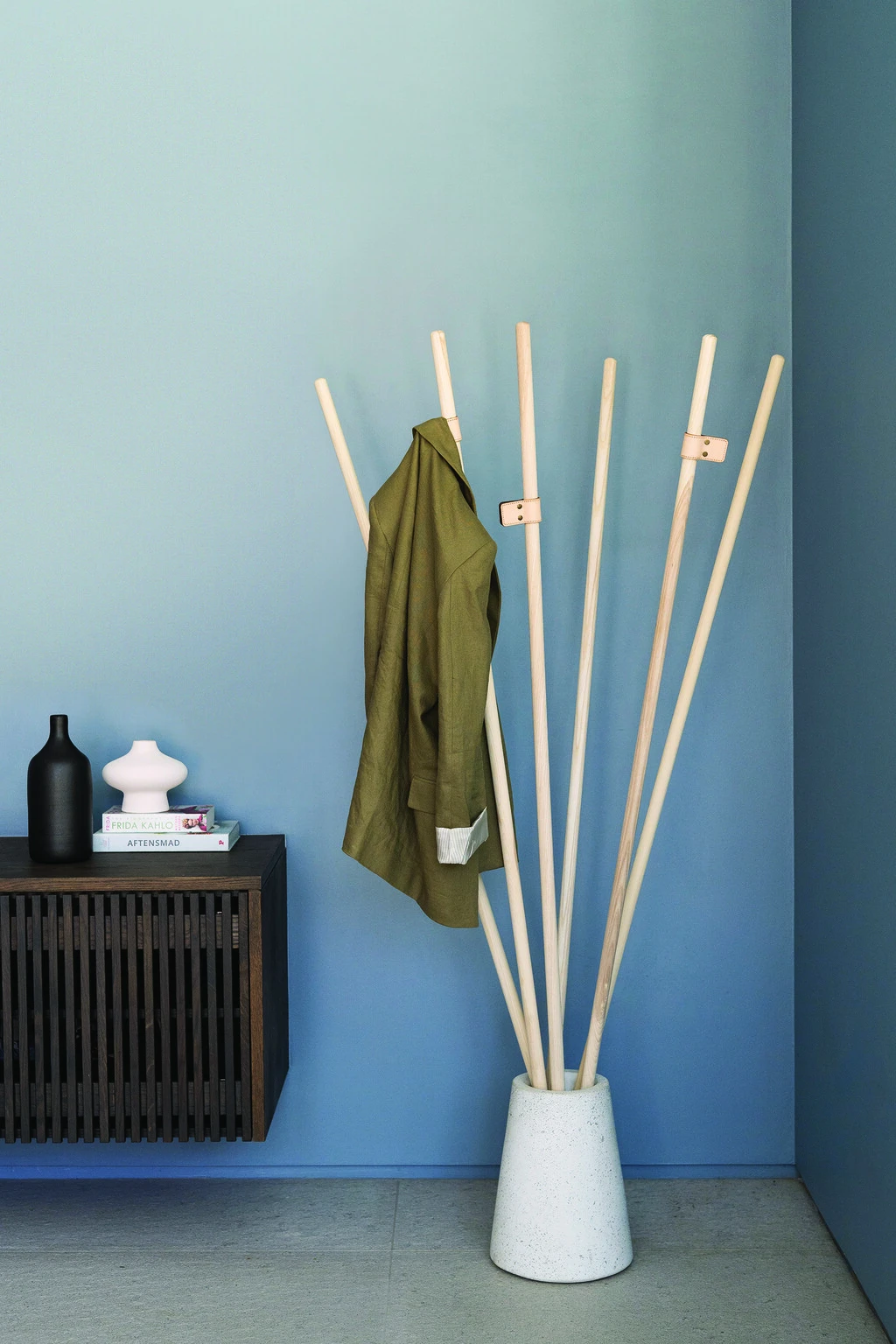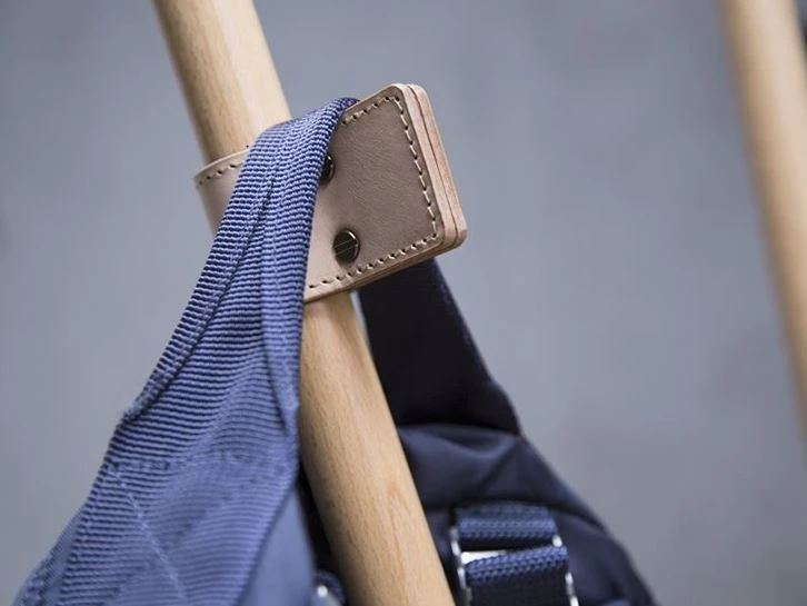 Den funktionelle læderstrop af høj kvalitet tilføjer karakter og gør det muligt at hænge tasker og alle former for tøj og accessories på Spaghetti Coat Rack/skumtjeren fra Ekta Living.
