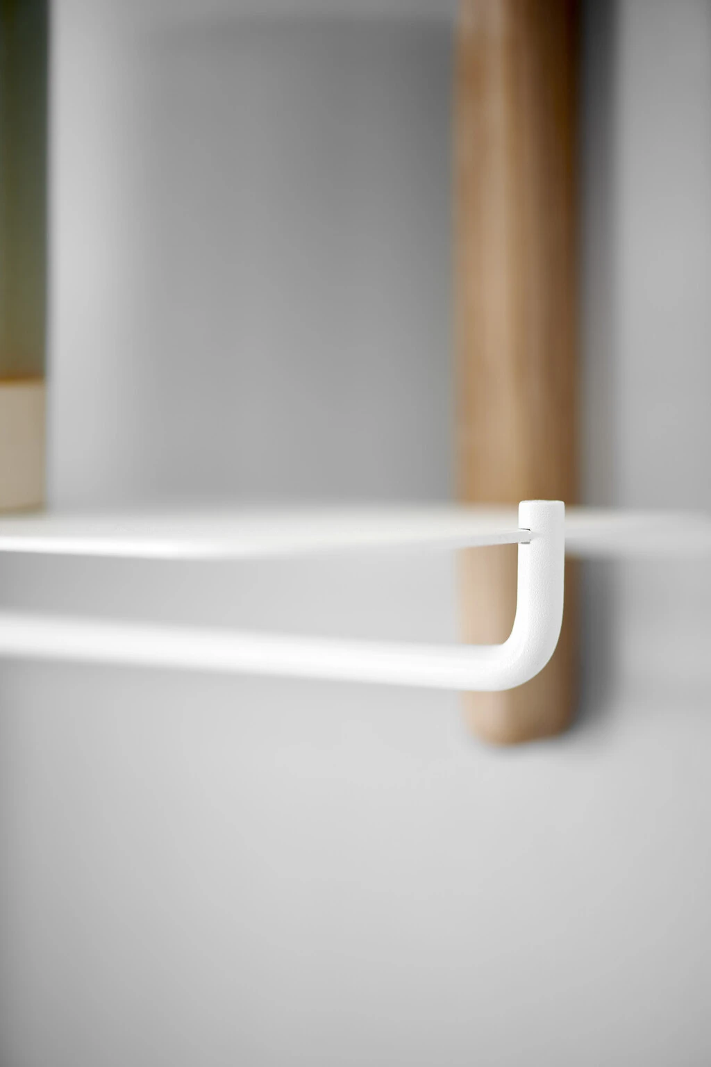 Nivo hylde stang og hylde kroge fås i både sort og hvid og sælges individuelt. Nivo hylde stang kommer i én størrelse til den “lille” Nivo, der matcher den korte Nivo hylde i størrelserne: Nivo A, B, E, F & G