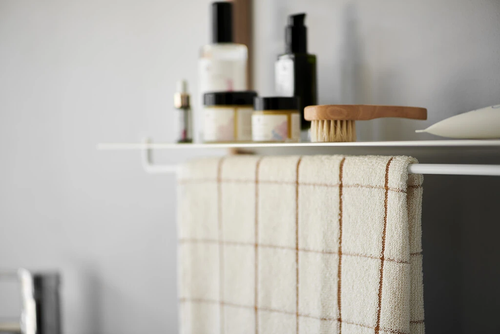 Nivo hylde stang og Nivo hylde kroge gør at Nivo hylden nu også kan bruges til at hænge eksempelvis viskestykker og gryder i køkkenet eller til håndklæder og tilbehør på badeværelset.