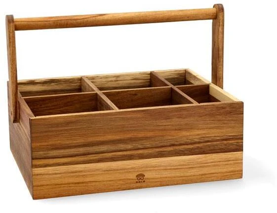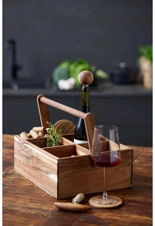 Stor multikasse i oliebehandlet akacietræ med plads til både flasker og tilbehør. Kassen har et solidt håndtag, fire store rum til flasker og to mindre rum til opbevaring af fx proptrækker, vinprop og glasbrikker. Kassen er din ideelle hjælper, når du henter dine favoritvine fra vinkøleskabet eller kælderen til dig selv og dine gæster. Varen er produceret i FSC®-certificeret akacietræ (FSC-C166612).