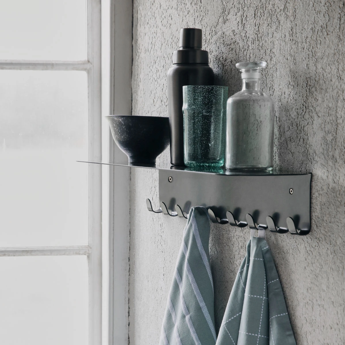 Få styr på din gang og garderobe med knagerækken Book fra House Doctor. En sort coating afslutter det moderne design, som er skabt til hjemmet, der trænger til opbevaring og lethed i indretningen. Med 9 knager og en hylde foroven er der fin plads til jakker, tasker og hvad du ellers har brug for at organisere. Hæng knagerækken i entréen eller soveværelset og brug den som et smart og pladsbesparende alternativ til en stumtjener.