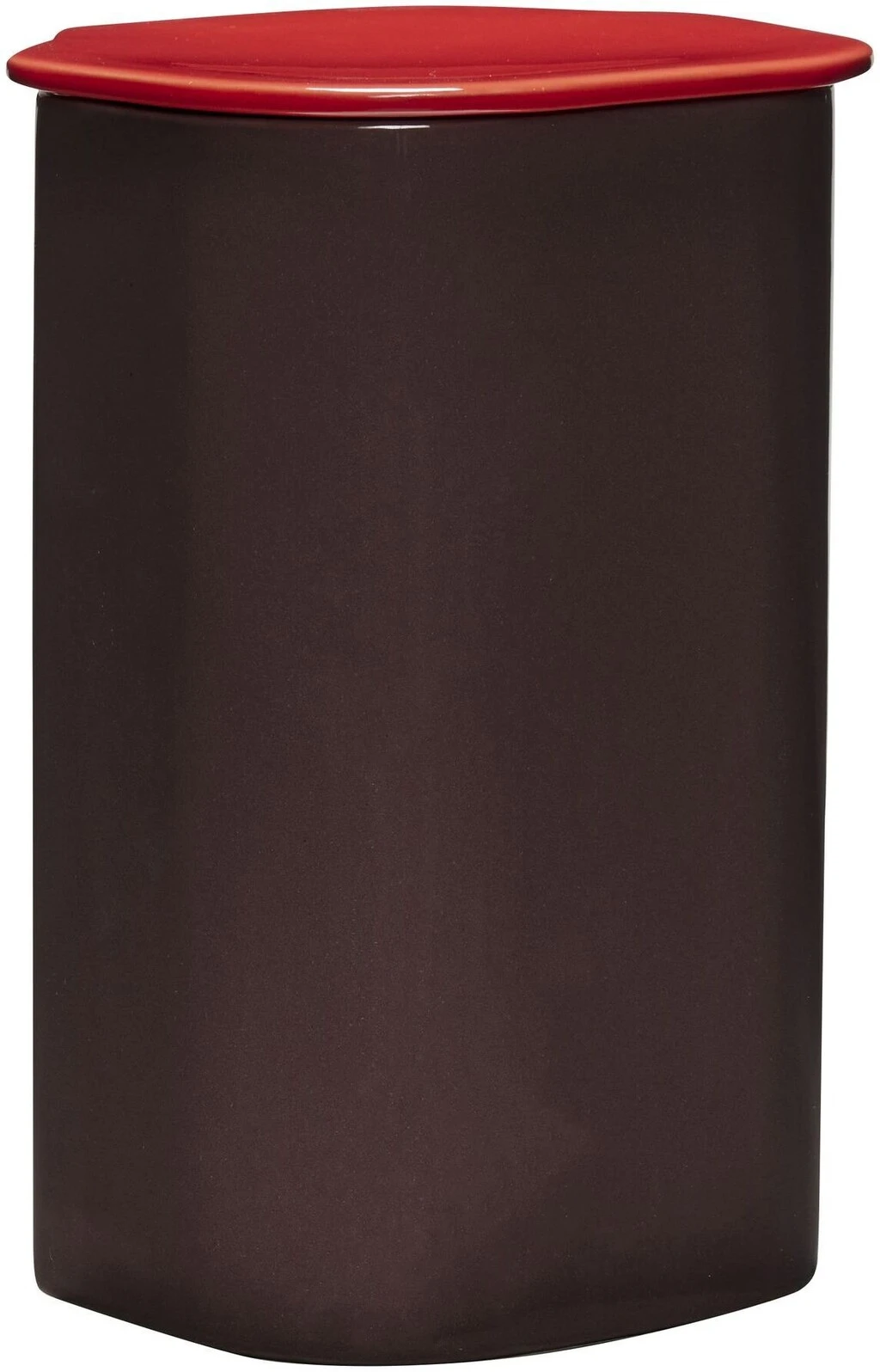 Keramisk opbevaringsbeholder med låg i rød og bordeaux.