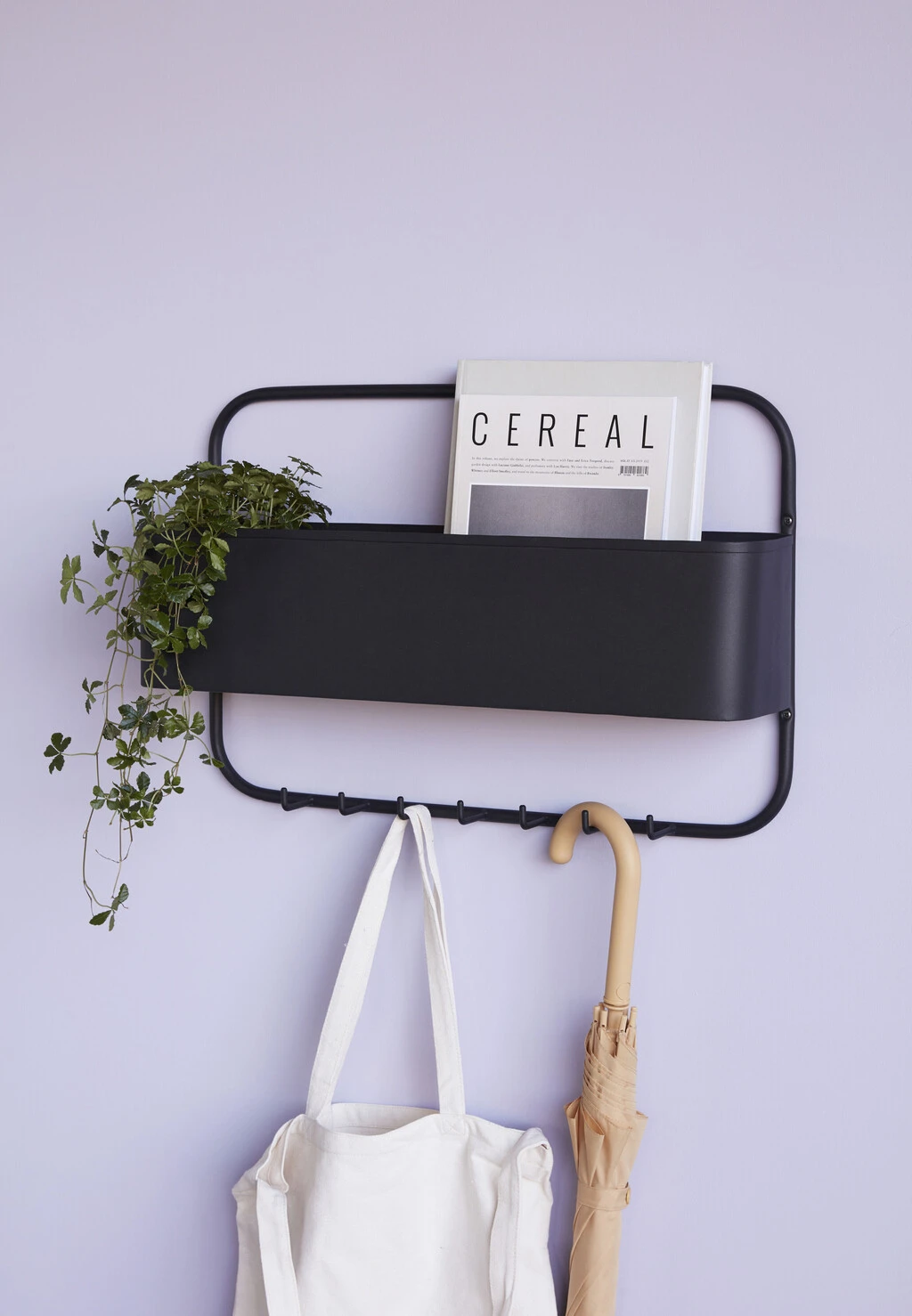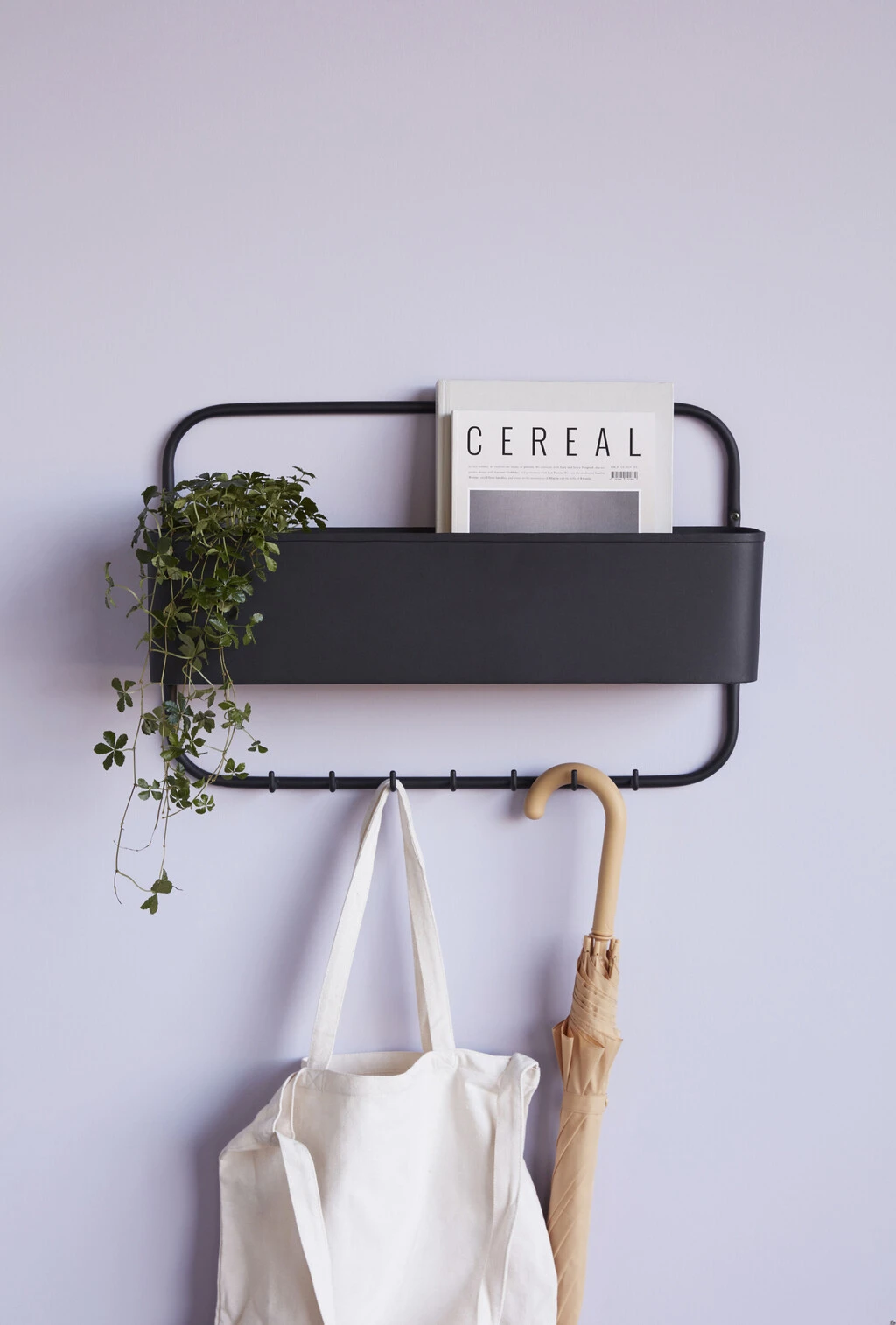 Denne knagerække tilbyder ikke kun opbevaring af dit overtøj, men også mulighed for opbevaring af mindre ting, planter, vaser og meget andet i hylden mens det rene design og det sorte metal, skaber et chik moderne look. Knagerækken kombinerer høj anvendelighed og stil i et enkelt stykke interiør.