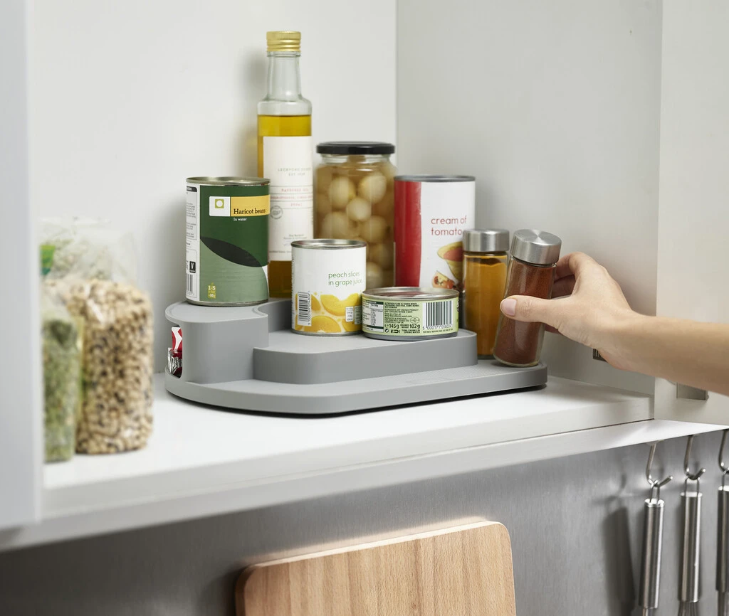 Denne enkle, men effektive opbevaringsløsning har en platform på lavt niveau med tre etager på en roterende base, som gør adgang let fra alle vinkler og hæver genstande op bagpå.