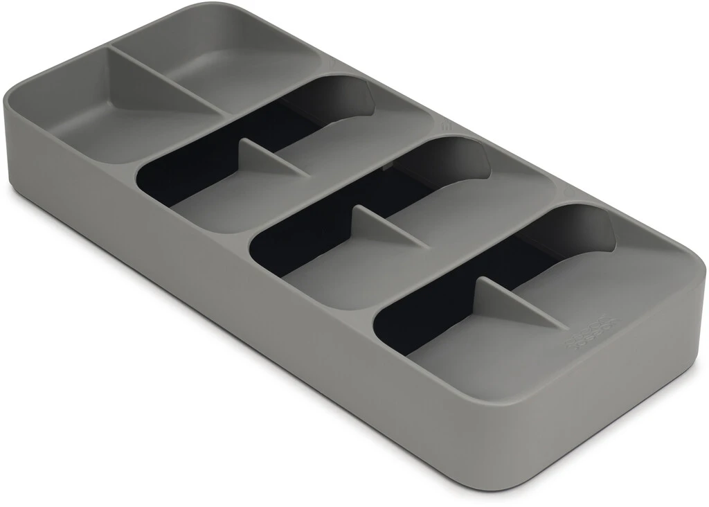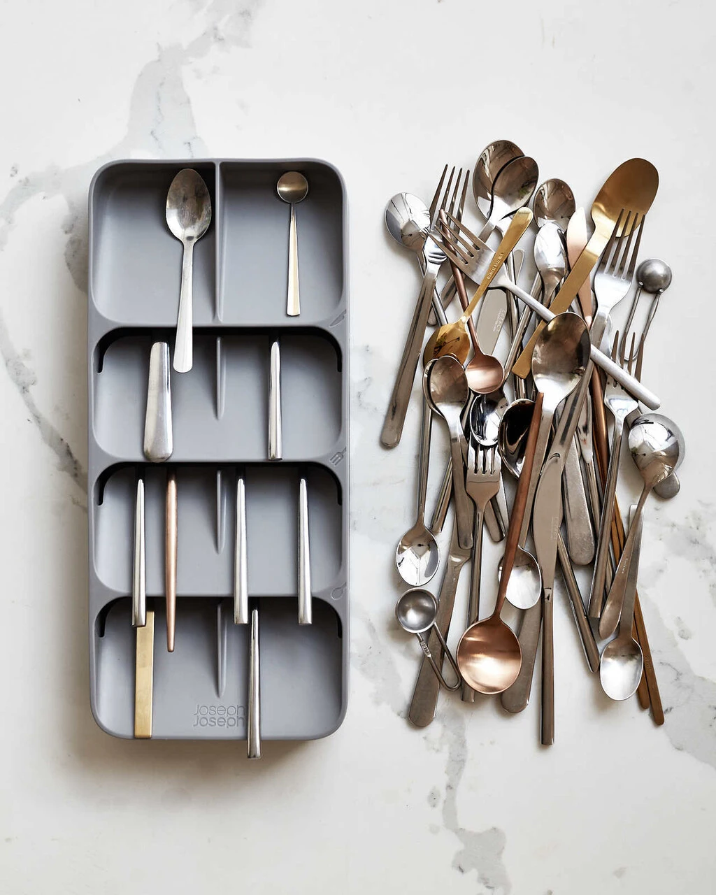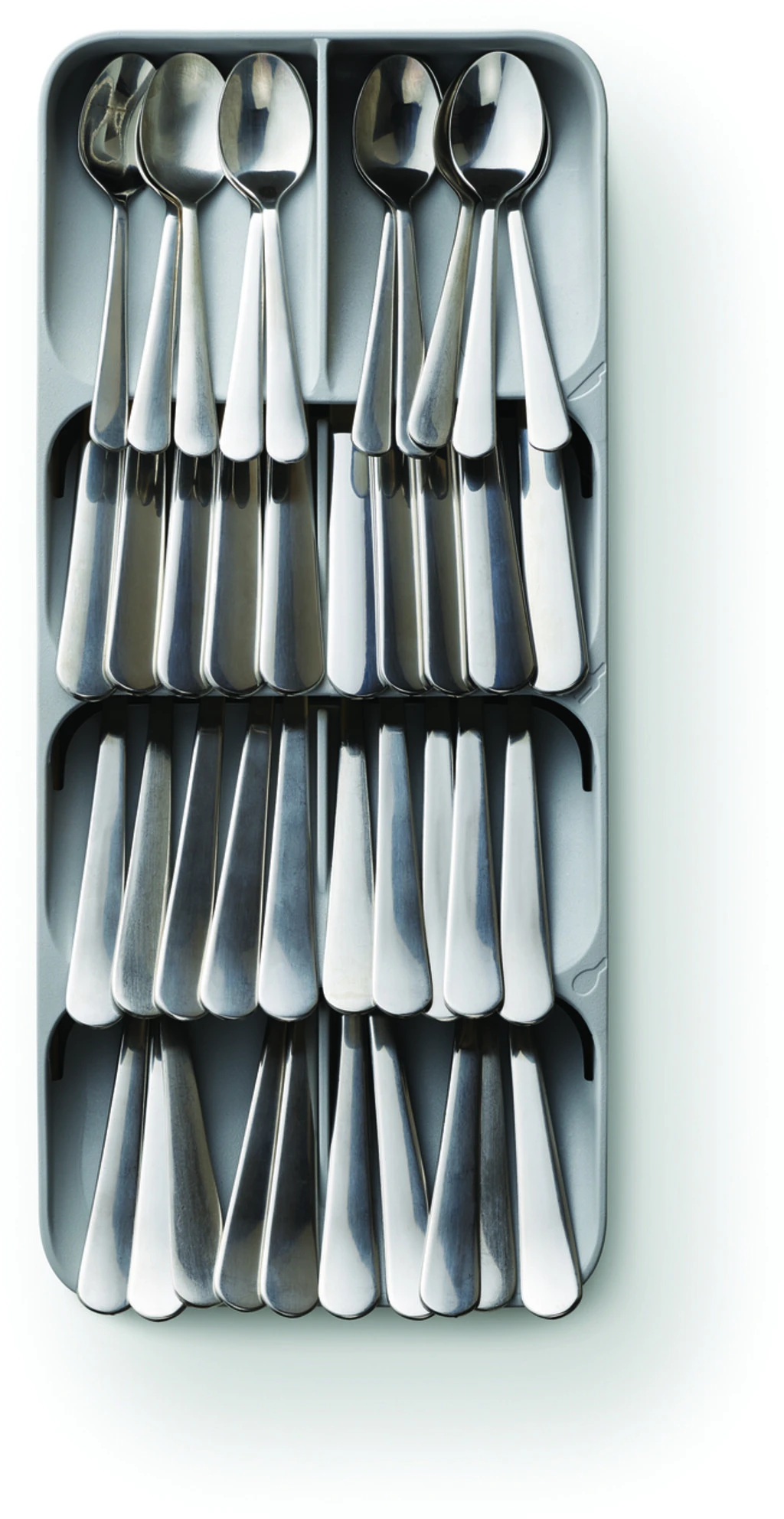 Det unikke design af denne bestikbakke har vinklede rum, der ligger oven på hinanden, så mere bestik kan opbevares på mindre plads.