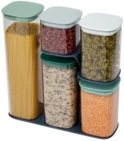 Dette smarte opbevaringsbeholdersæt har 5 madopbevaringsbeholdere med et smart stativ, der giver nem adgang til enhver krukke, uanset dens placering.