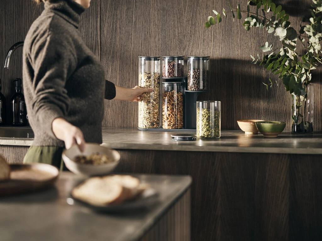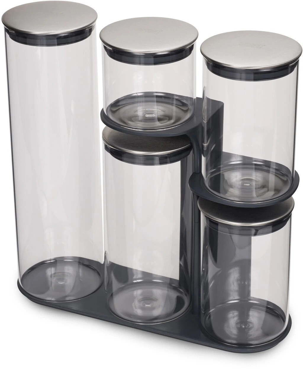 Dette smarte opbevaringsbeholdersæt har et smart stativ, der giver nem adgang til enhver krukke, uanset dens placering. Beholderne er lavet af glas med lufttætte låg i rustfrit stål.
