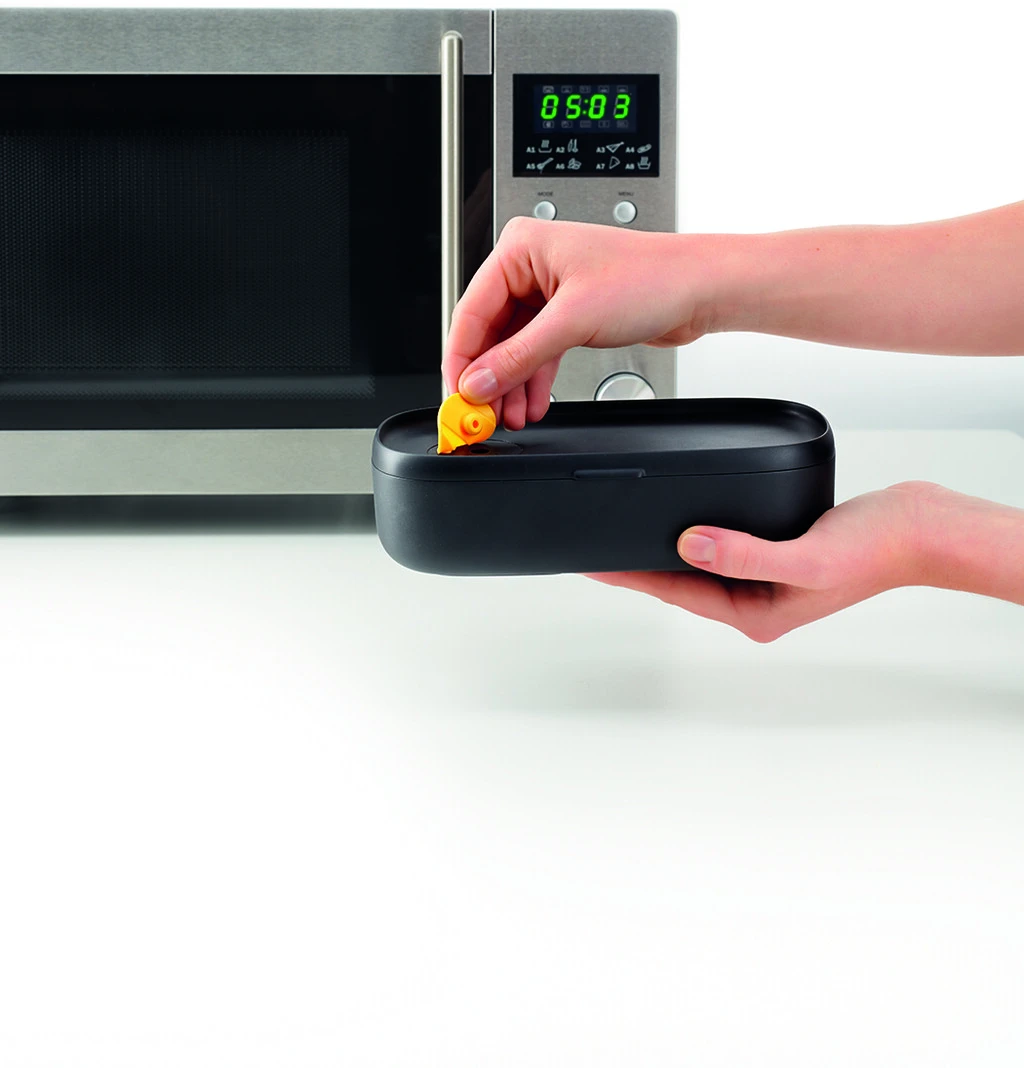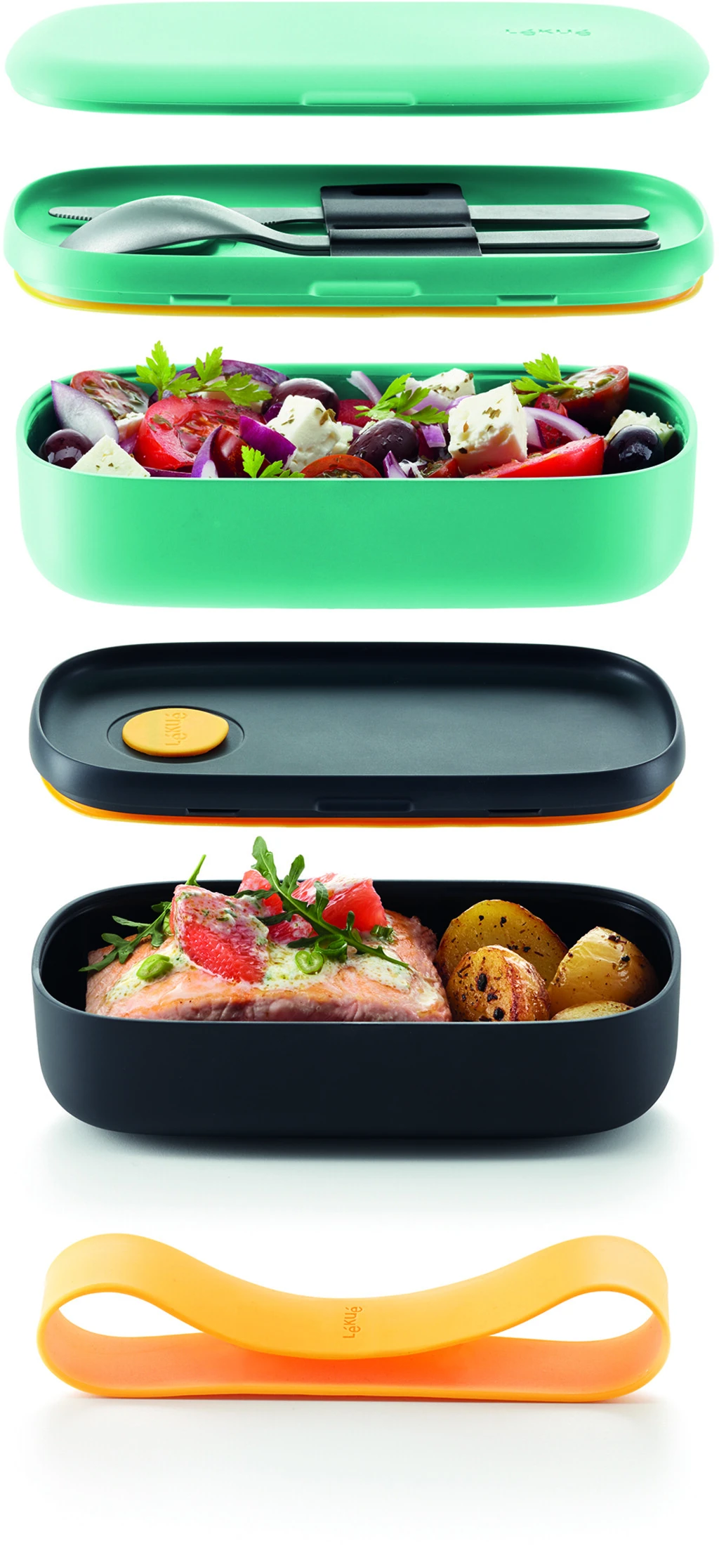 To Go Madkassen er 100 % lufttæt og består af to beholdere, 500 ml hver. Beholderne er begge sammenføjet af en silikone kant for lettere transport. Beholderne holdes samlet med et tykt silikonebånd. Begge beholdere er sikkert at bruge i mikrobølgeovnen, den nederste beholder har en indbygget ventil for at sikre, at den er helt lufttæt og lækagesikker. I den øverste beholder er der et ekstra låg til opbevaring af bestik. To Go Madkassen er lavet i et minimalistisk og delikat design uden klips eller fastgørelseselementer. To Go Madkassen er turkis og sort, og har et rødt silikonebånd, madkassen kan både tåle mikrobølgeovn, opvaskemaskine og køleskab.