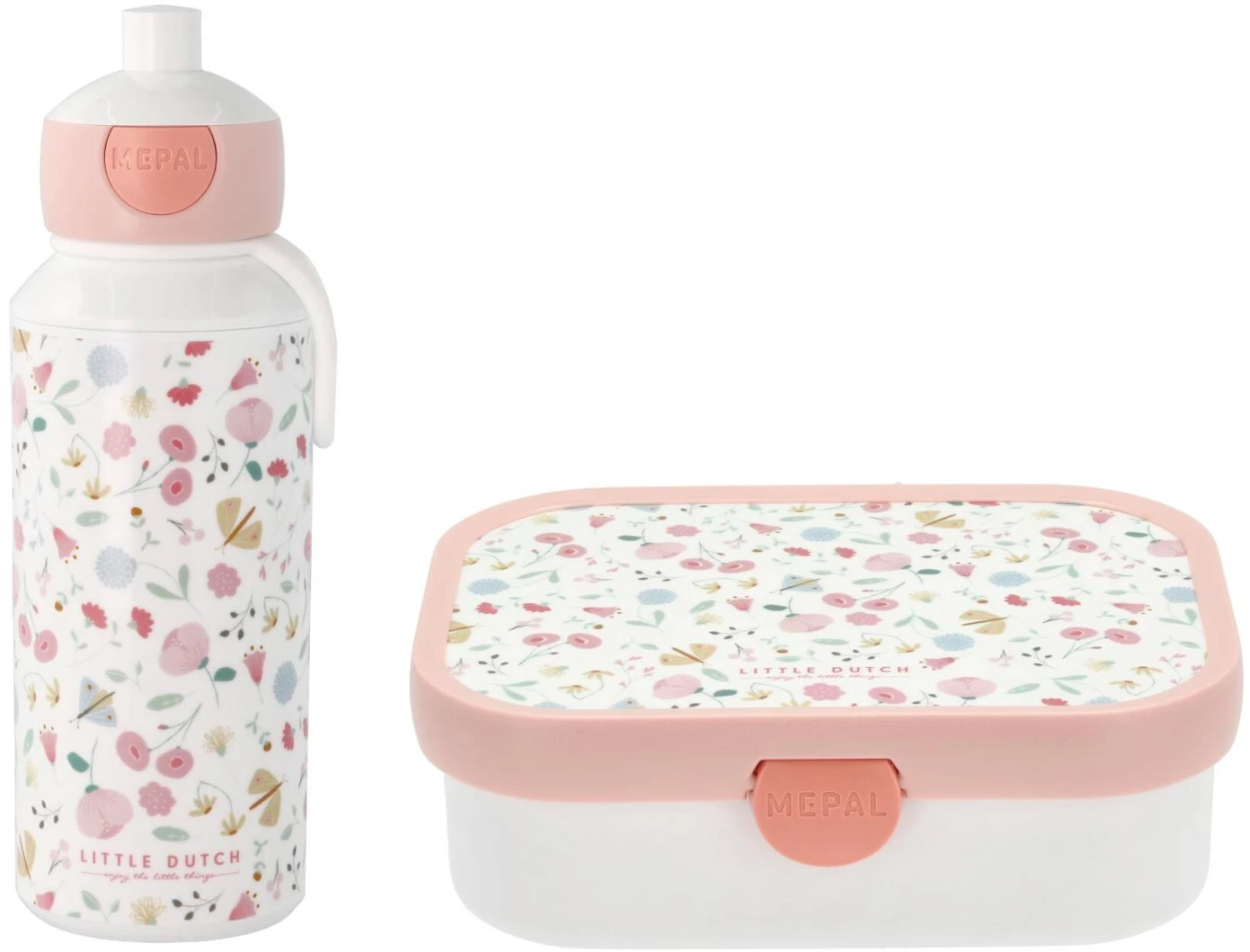 En madkasse med en lille gaffel og en aftagelig indsats med to små rum samt en drikkeflaske på 400 ml med et smart pop-up system med mundstykke, der nemt udløses ved tryk på en knap.