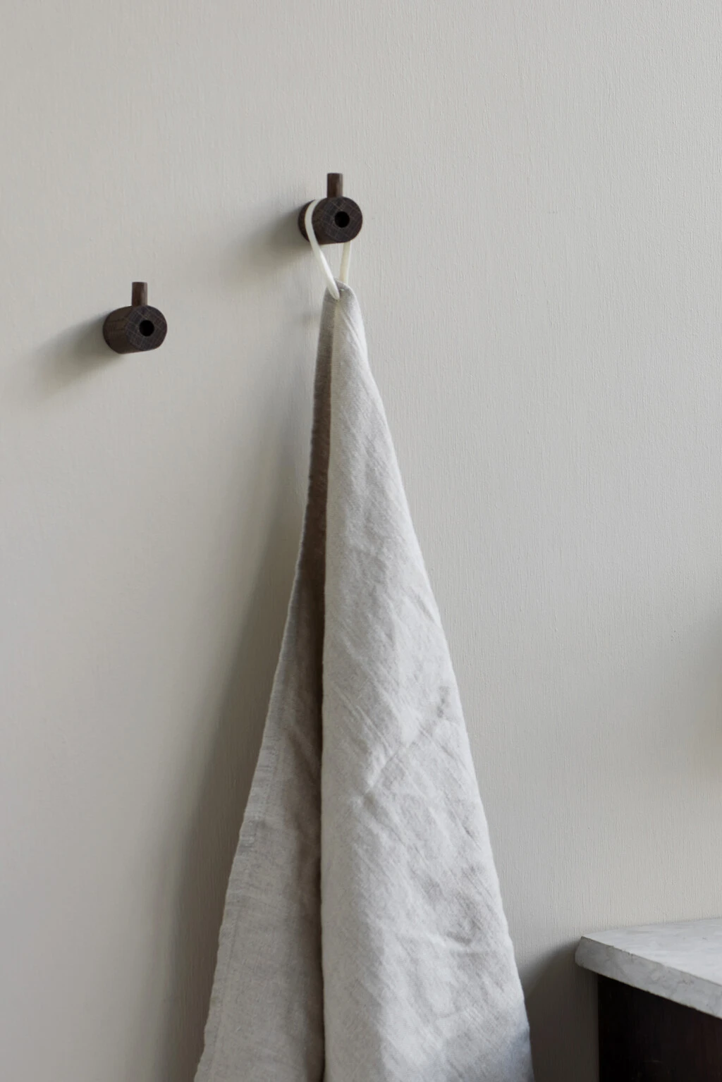 Wooden Wall Hook er dannet af to stykker massiv eg. Den største del er fastgjort til væggen, hvor den anden derefter stikker ind i den første ovenfra, hvilket skjuler skruen og giver det perfekte hængepunkt. Wooden Wall Hook fungerer både fantastisk alene og i serie.