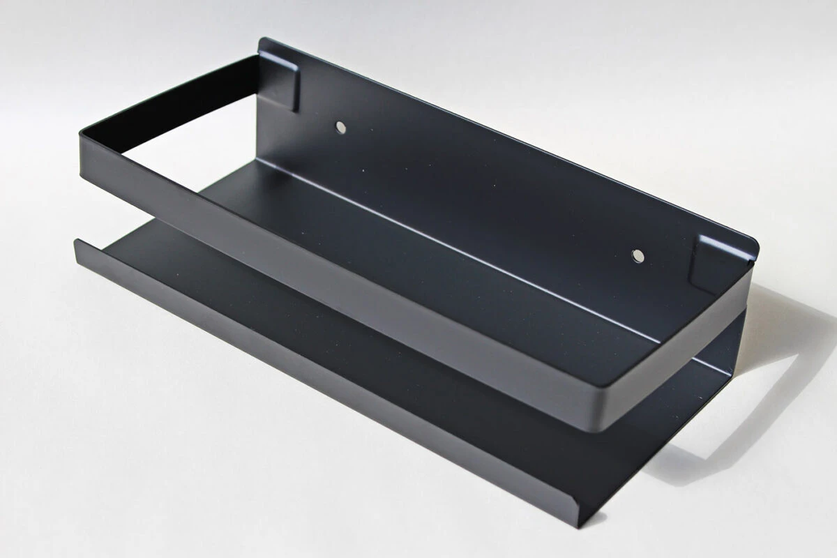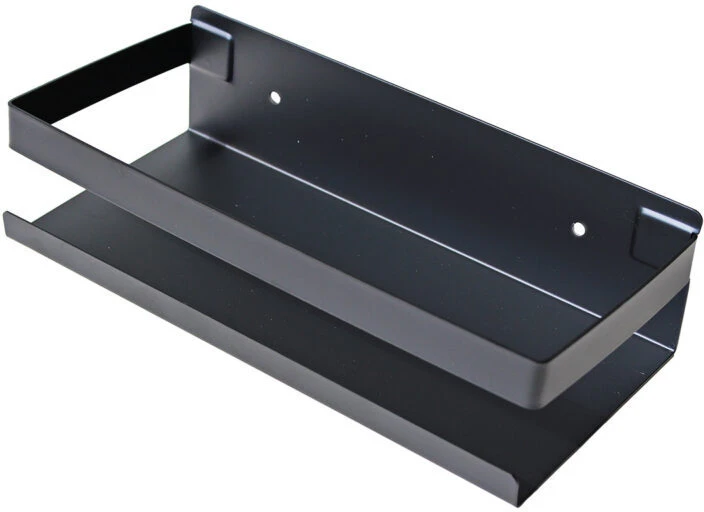 Denne hylde til badet eller fx køkkenet er fremstillet i rustfrit stål med mat sort finish. Der medfølger skruer og ravplugs til ophæng samt sorte hætter til at montere over skruerne. Selve hylden er lavet med et lille fald, så vand vil samle sig foruden på hylden og dermed nemt kan fjernes.