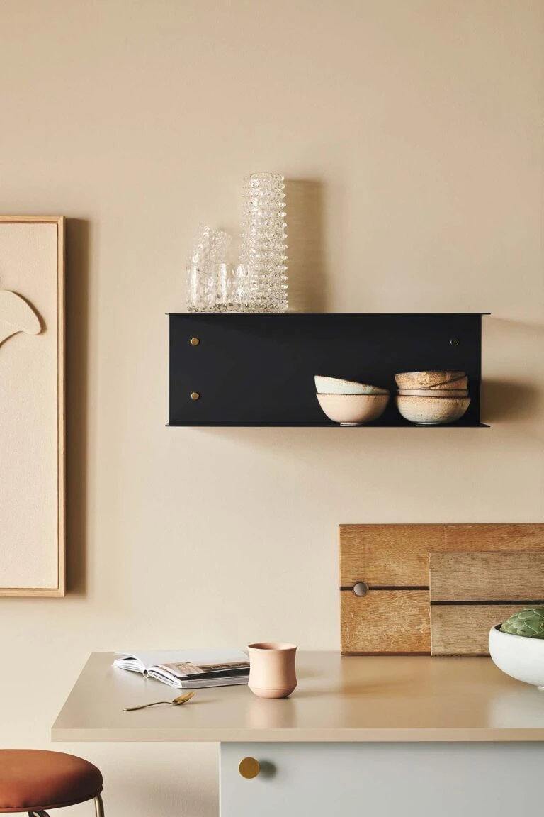 Denne sorte metal hylde i stål er produceret i Danmark, og kvaliteten er i absolut top. Det vil være en hylde, som med sit tidløse design og høje kvalitet vil pynte i din indretning i mange år.