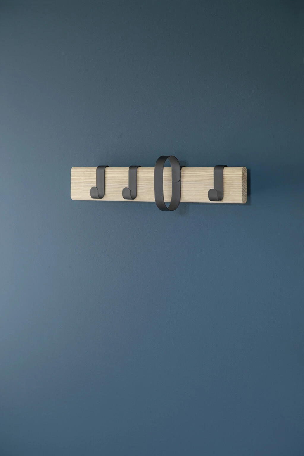 Knagerækken er i FSC® certificeret eg og matsort pulverlakeret metal. Skruer og standard rawlplugs til vægmontering medfølger.