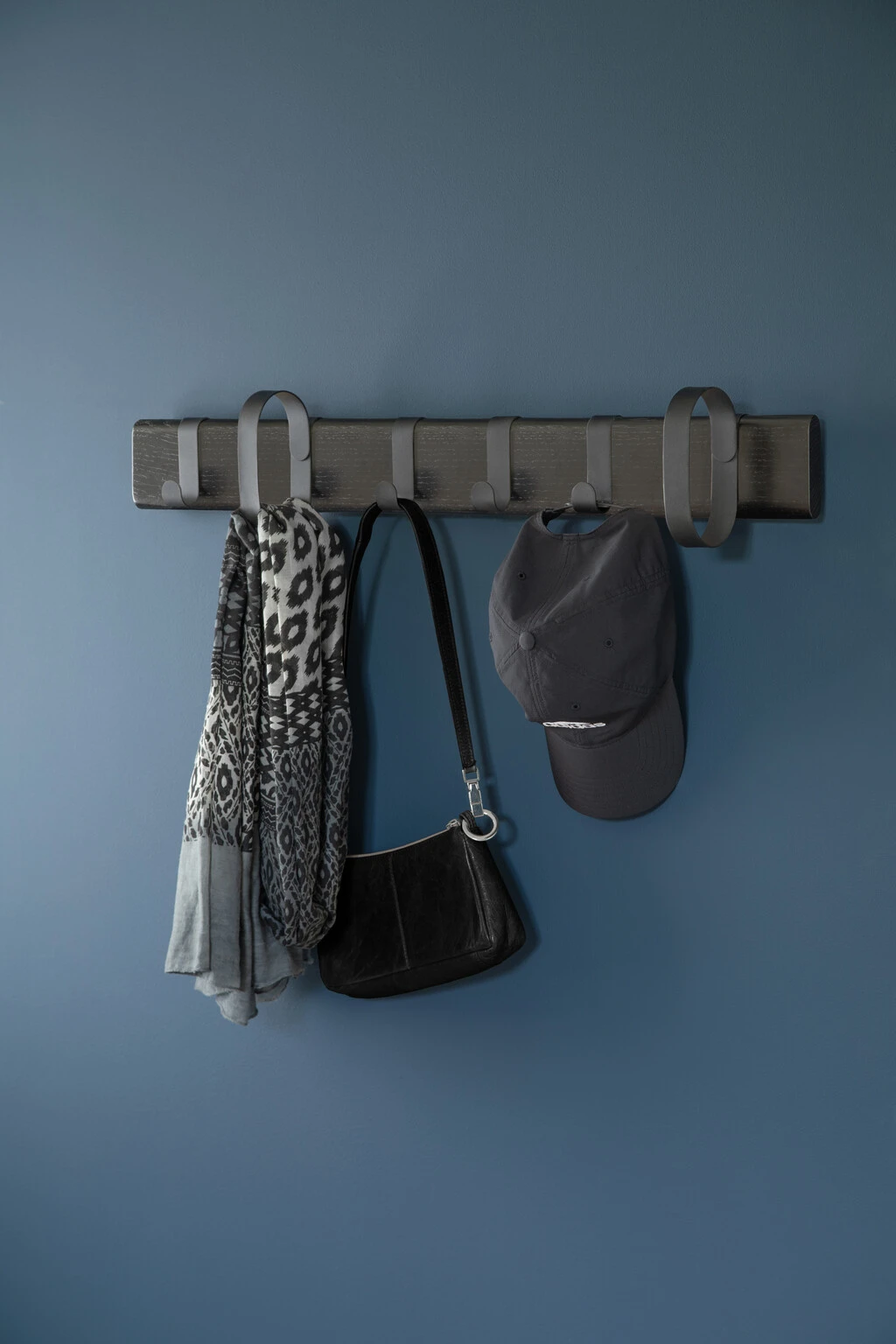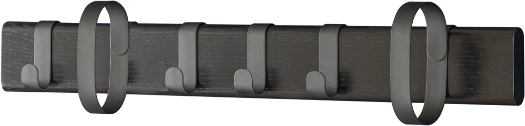 Knagerækken er i FSC® certificeret eg og matsort pulverlakeret metal. Skruer og standard rawlplugs til vægmontering medfølger.