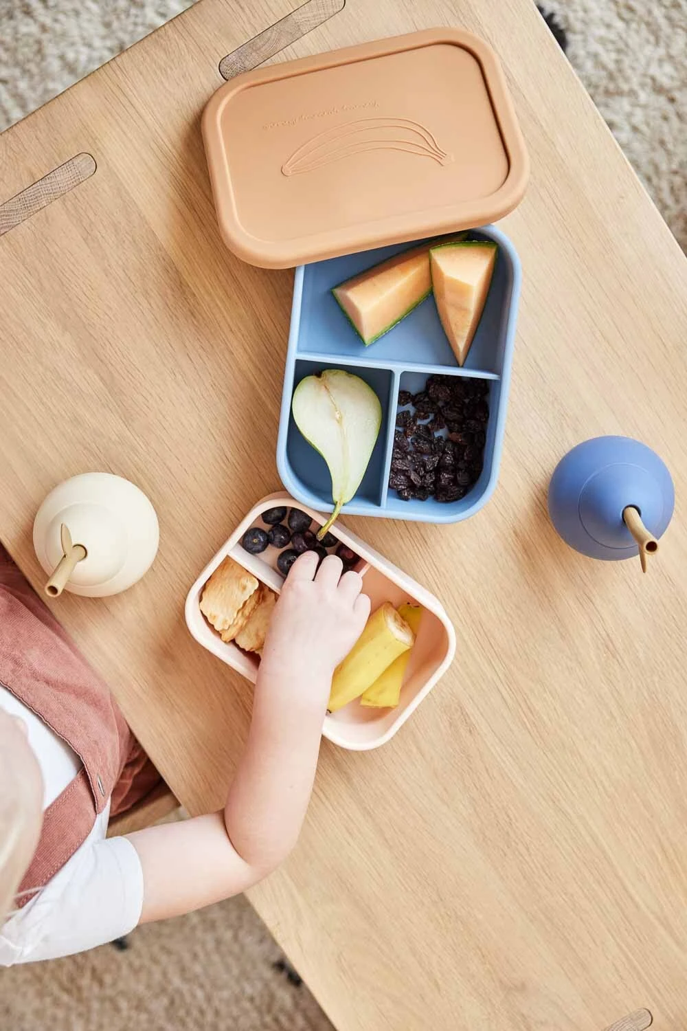 Vores Yummy madkasse er lavet i 100% silikone og har et sødt silikonelåg med et karakteristisk Yummy print og er opdelt i tre praktiske rum til opdeling af mad og snacks.