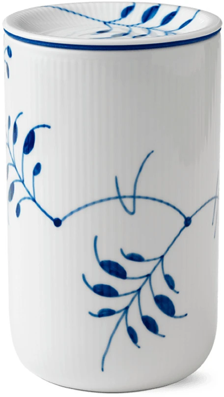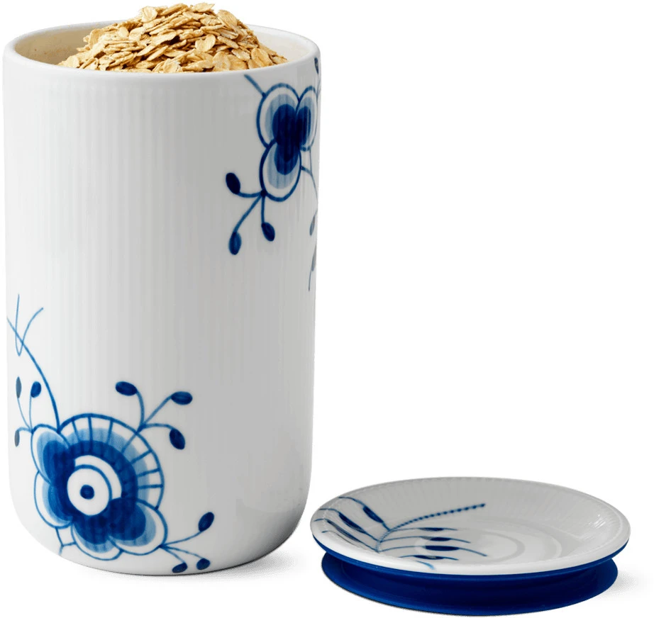 Den unge designstuderende, Karen Kjældgård-Larsen, præsenterer Royal Copenhagen for en dristig idé: En dramatisk nyfortolkning af det klassiske Musselmalede stel. Hendes design bryder alle traditioner samtidig med, at det håndmalede håndværk er bevaret. Forstørrelsen af det klassiske mønster skaber et ekstraordinært og enestående udtryk, hvor det oprindelige mønster stadig er genkendeligt. Musselmalet Riflet er genfødt. Med denne genfødsel har mønstret fra 1775 gennemgået en udvikling, og en moderne klassiker er født. Denne opbevaringskrukke er både elegant og funktionel. Omkring låget er påført en silikonering, der sørger for, at det lukker tæt. Det smukke Blå Mega Riflede mønster giver den et enkelt udtryk, og porcelænskrukken passer dermed ind i ethvert af husets rum.