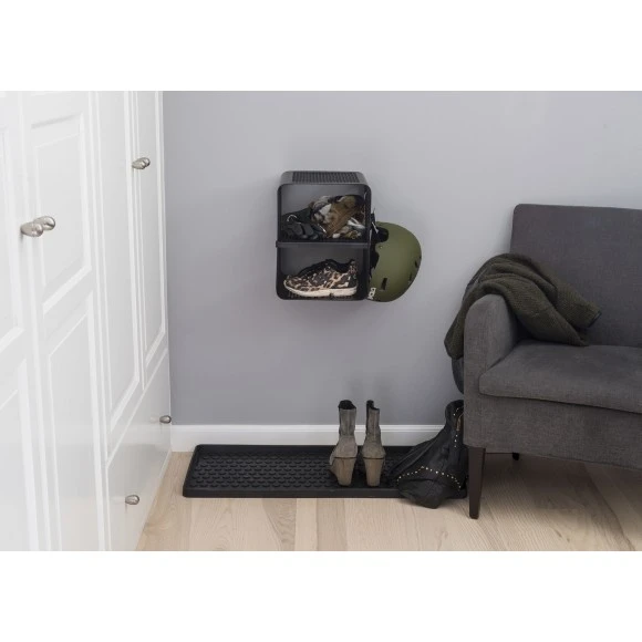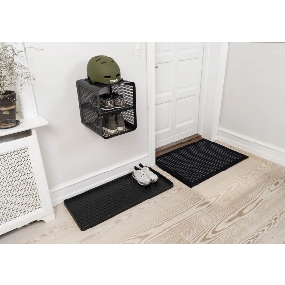 Der kan tilkøbe måtter til hylderne, så skidt og vand under sko ikke drysser ned på sko på hylden under.