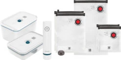 Et sæt indeholder alt. Det 8-delte ZWILLING FRESH & SAVE vakuumstartsæt har alt hvad du behøver for at komme i gang med vakuumpakning. Dine proviant holder sig frisk i op til fem gange længere sammenlignet med konventionel opbevaring uden vakuumpakning. Med ZWILLING Fresh & Save vakuumserien kan du undgå madspild, forberede mad længere tid i forvejen og holde mad friskere i op til 5 gange længere sammenlignet med andre opbevaringsmetoder uden brug af vakuum. Vakuumopbevaring bibeholder vigtige vitaminer samt næringsstoffer i den opbevarede mad.