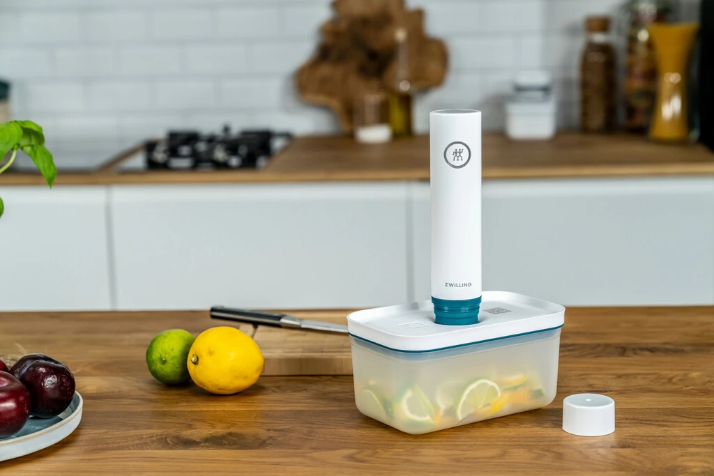 Fresh & Save vakuumbeholder i mat BPA fri plast i str. M 1,1 L. Med ZWILLING Fresh & Save vakuumserien kan du undgå madspild, forberede mad længere tid i forvejen og holde mad friskere i op til 5 gange længere sammenlignet med andre opbevaringsmetoder uden brug af vakuum. Vakuumopbevaring bibeholder vigtige vitaminer samt næringsstoffer i den opbevarede mad.