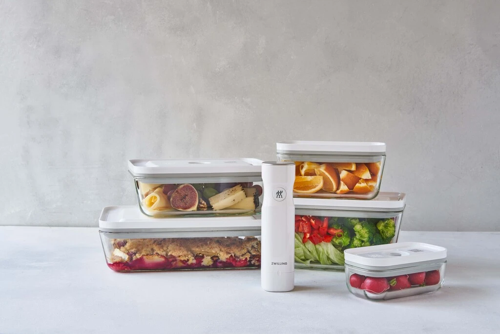 Vakuumbeholder til køleskabet i glas med låg i plast med et litermål på 2 L. Ideel til f.eks. opbevaring af ost eller pålæg. Med ZWILLING Fresh & Save vakuumserien kan du undgå madspild, forberede mad længere tid i forvejen og hold mad friskere i op til 5 gange længere sammenlignet med andre opbevaringsmetoder uden brug af vakuum. Vakuumopbevaring bibeholder vigtige vitaminer samt næringsstoffer i den opbevarede mad. Vakuumbeholderen i glas kan gå i opvaskemaskinen, mikrobølgeovnen, ovnen op til 180 °C, køleskabet og fryseren indtil -20,00 °C. Disse produkter kan kombineres med produkterne fra samlemærkekampagnerne. Download Zwilling Culinary World app og scan QR koden på lågene og poserne. App’en minder dig herefter om hvornår maden skal bruges, og kommer med forslag til opskrifter, som den kan bruges i.