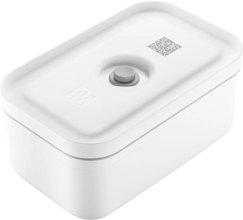 Vakuum madkasse M fra ZWILLING Fresh & Save med et litermål på 0,85 L i hvidt BPA fri plast. Nyd en sprød salat, eller friskt brød samt frugt, der ikke er blevet misfarvet flere dage efter maden er forberedt. Med ZWILLING Fresh & Save vakuumserien kan du undgå madspild, forberede mad længere tid i forvejen og holde mad friskere i op til 5 gange længere sammenlignet med andre opbevaringsmetoder uden brug af vakuum. Vakuumopbevaring bibeholder vigtige vitaminer samt næringsstoffer i den opbevarede mad. Placér maden i vakuumbeholderen, lad den køle helt af og placér så pumpen på låget. Det tager kun få sekunder og så kan vakuumbeholderen stilles i køleskabet eller fryseren, hvor maden holder sig frisk og man undgår frostskader. Vakuumbeholderen i BPA fri plast kan gå i mikroovnen og opvaskemaskinen samt køleskabet og fryseren. Vakuumbeholderne bør ikke fyldes helt, da vakuum ellers ikke vil være muligt at opnå. Disse produkter kan kombineres med produkterne fra samlemærkekampagnerne. Download Zwilling Culinary World app og scan QR koden på lågene og poserne. App’en minder dig herefter om hvornår maden skal bruges, og kommer med forslag til opskrifter, som den kan bruges i.