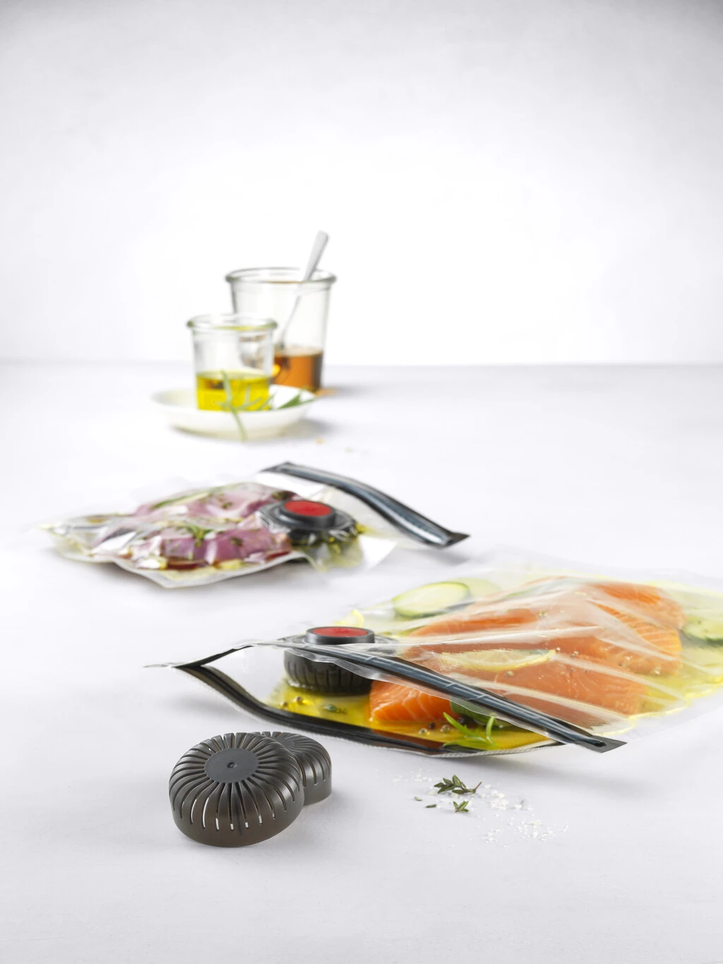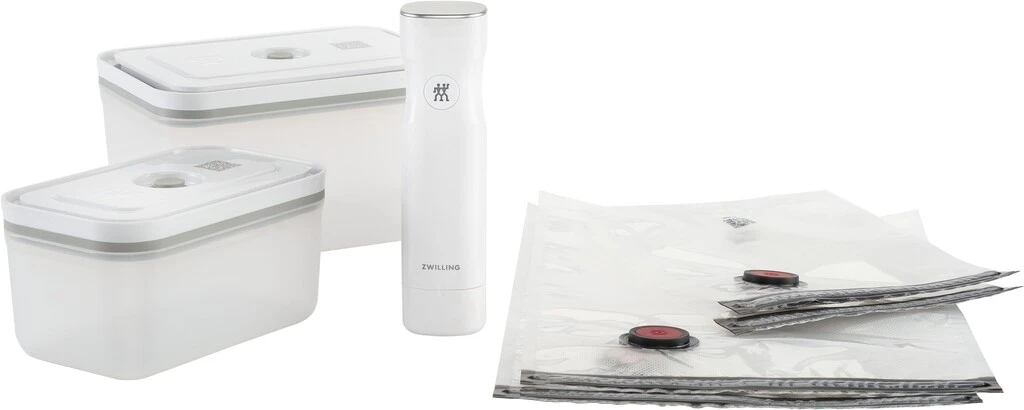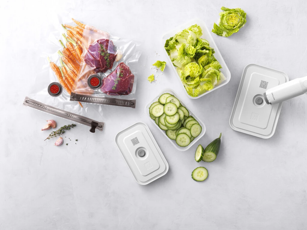 Fresh & Save Startersæt inkl. 7 dele med vakuumbeholdere i BPA fri plast. Med ZWILLING Fresh & Save vakuumserien kan du undgå madspild, forberede mad længere tid i forvejen og holde mad friskere i op til 5 gange længere sammenlignet med andre opbevaringsmetoder uden brug af vakuum. Vakuumopbevaring bibeholder vigtige vitaminer samt næringsstoffer i den opbevarede mad. Placér maden i vakuumbeholderen eller vakuumposen, lad den køle helt af og placér så pumpen på låget. Det tager kun få sekunder og så kan vakuumbeholderen eller vakuumposen stilles i køleskabet eller fryseren, hvor maden holder sig frisk og man undgår frostskader. Sættet består af en vakuumpumpe, to vakuumposer i str. S (1,25 L, mål: 23×20 cm) og to i str. M (4 L, mål 35 x 25 cm), en 1,1 L plastbeholder samt en 2,3 L plastbeholder. Beholderen må ikke fyldes helt op, da der skal være luft i beholderen for at kunne skabe vakuum. Vakuumbeholderne i plast kan gå i opvaskemaskinen, mikrobølgeovnen, køleskabet og fryseren. Vakuumposerne kan også gå i mikrobølgeovnen og fryseren og er derudover varmebestandige op til 100° C, hvilket gør dem ideelle til Sous vide madlavning. Disse produkter kan kombineres med produkterne fra samlemærkekampagnerne. Download Zwilling Culinary World app og scan QR koden på lågene og poserne. App’en minder dig herefter om hvornår maden skal bruges, og kommer med forslag til opskrifter, som den kan bruges i.