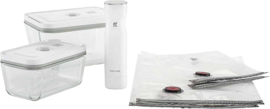 Fresh & Save Startersæt inkl. 7 dele med vakuumbeholdere i glas. Med ZWILLING Fresh & Save vakuumserien kan du undgå madspild, forberede mad længere tid i forvejen og holde mad friskere i op til 5 gange længere sammenlignet med andre opbevaringsmetoder uden brug af vakuum. Vakuumopbevaring bibeholder vigtige vitaminer samt næringsstoffer i den opbevarede mad. Placér maden i vakuumbeholderen eller vakuumposen, lad den køle helt af og placér så pumpen på låget. Det tager kun få sekunder og så kan vakuumbeholderen eller vakuumposen stilles i køleskabet eller fryseren, hvor maden holder sig frisk og man undgår frostskader. Sættet består af 7 dele: 1 vakuumpumpe inkl. USB kabel til opladning af pumpen, 2 stk. vakuumposer i str. S (1,25 L, mål: 23×20 cm) og 2 stk. vakuumposer i str. M (4 L, mål 35 x 25 cm), 1 stk. 0,9 L vakuumbeholder i glas samt 1 stk. 2 L vakuumbeholder i glas. Beholderen må ikke fyldes helt op, da der skal være luft i beholderen for at kunne skabe vakuum. Vakuumbeholderne i glas kan gå i opvaskemaskinen, mikrobølgeovnen, ovnen op til 180 °C, køleskabet og fryseren. Vakuumposerne kan også gå i mikrobølgeovnen og fryseren og er derudover varmebestandige op til 100° C, hvilket gør dem ideelle til sous vide. Disse produkter kan kombineres med produkterne fra samlemærkekampagnerne. Download Zwilling Culinary World app og scan QR koden på lågene og poserne. App’en minder dig herefter om hvornår maden skal bruges, og kommer med forslag til opskrifter, som den kan bruges i.