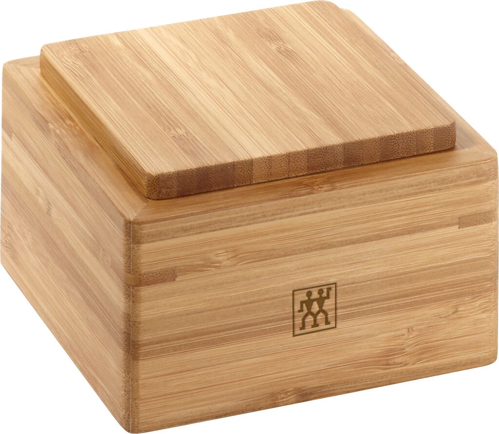Fin kvadratisk opbevaringsboks i bambus med låg. Boksen måler 11 cm x 11 cm og har en højde på 6 cm. Den lille størrelse gør den ideel som opbevaring til krydderier, eller til salt.